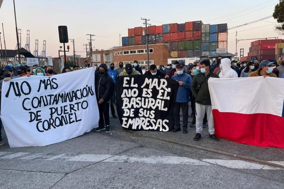 Cientos de pescadores artesanales, mariscadores y algueros se manifestaron frente a las oficinas de la Compañía Puerto Coronel S.A., para expresar su rechazo a la oferta realizada por esa empresa frente a la demanda por contaminación presentada en 2019 por 2.334 personas que viven en la ciudad de Coronel y que realizan actividades productivas asociadas al mar.