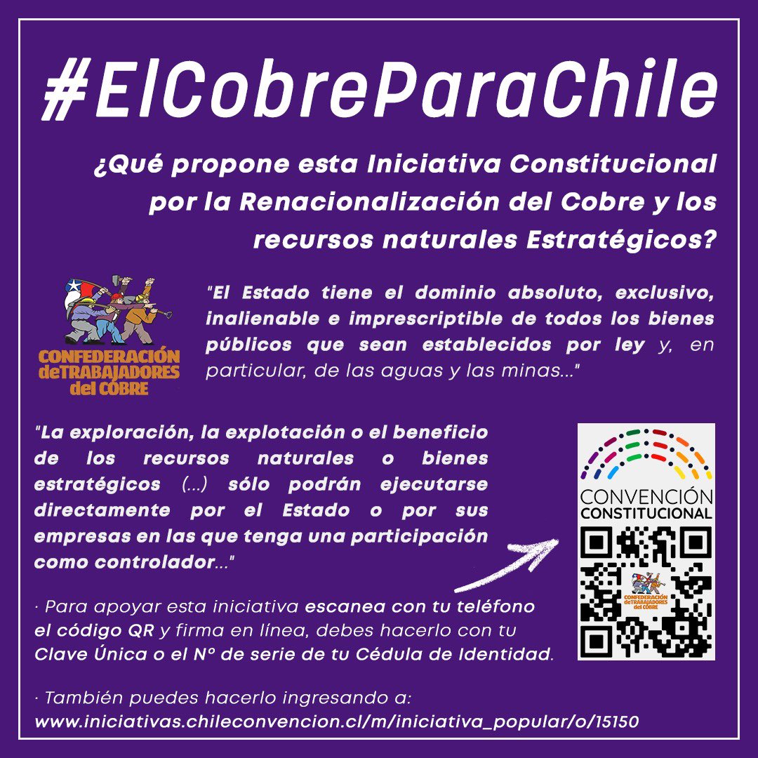 Leer másChile. Por el bien común, apóyanos en la Iniciativa Constitucional para Renacionalizar el Cobre y los recursos estratégicos: Sólo restan 15 días para firmar la propuesta de la clase trabajadora y el pueblo